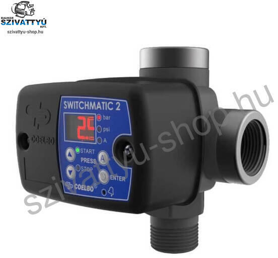 A Coelbo Switchmatic 2 T-KIT digitális nyomáskapcsoló egy kiváló minőségű elektronikus nyomáskapcsoló, egyfázisú elektromos szivattyúk indításához és leállításához, azaz vezérléséhez max 3HP (2,2KW-os) motor teljesítményig (16A). A készüléket tágulási tartállyal, azaz hidrofor tartállyal együtt kell használni! A Switchmatic 2 T-KIT nyomáskapcsoló digitális nyomásmérővel rendelkezik. A bekapcsolási és kikakpcsolási érték is külön állítható 0,1 bar lépésekkel. Elektromos bekötése a hagyományos mechanikus nyomáskapcsolókkal megegyezik. A Switchmatic 2 T-KIT digitális nyomáskapcsoló 1-8 bar nyomás között használható. A differenciál , tehát a ki és bekapcsolási nyomás érték közötti különbség maximum értéke 7,0 bar lehet. Ez a digitális nyomáskapcsoló számos védelmi funkciókkal is rendelkezik. Például szárazon futás elleni védelem, automatikus újraindítási funkcióval ellátva. Gyakori ki és bekapcsolás elleni védelem. Ez akkor jelent kifejezetten jelentős védelmet, ha a hidrofor tartályban kevés a levegőnyomás.