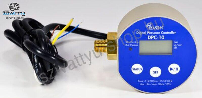 Digitális nyomáskapcsoló maximum 1500W-os szivattyúkhoz, szárazon futás elleni védelemmel. Evak DPC-10 IP 55 védettséggel kerti szivattyúkhoz, búvárszivattyúkhoz, centrifugál szivattyúkhoz, maximum 10 bar nyomásig.