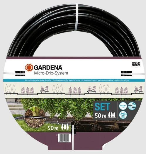 GARDENA MDS Csepegtető cső növénysorokhoz 50 m a sövények, bokrok, cserjék vagy előkerti növények víztakarékos és megbízható öntözéséhez. A használatra kész készlet tartalmazza a használathoz szükséges összes alkatrészt. Gyorsan, néhány jól elmagyarázott lépésben telepíthető. Először csatlakoztasd a víztömlőt az Alapelem 1000-hez az egyenletes nyomás érdekében. Ezután csatlakoztasd az Alapelemhez az 50 m hosszú csepegtető csövet és vezesd a növényekhez. Ha a föld alá kerül, a gyökér-benövésgátlóval ellátott, intelligens labirintus technológia biztosítja, hogy a cső ne duguljon el. A csőbe 30 cm-ként nyomáskiegyenlítő csepegtető van beépítve. A csepegtetők még a magasságkülönbségek ellenére is folyamatosan 1,6 liter vizet juttatnak óránként a sövényhez, így az egyenletesen öntözhető. A külön kapható 13 mm-es csatlakozókkal, a szabadalmaztatott „Klikk és kész csatlakoztatási technológiával mindig van lehetőség a Micro-Drip-System rugalmas bővítésére és átalakítására. Az MDS-alkatrészek nem sérülnek, és hosszú távon, tetszőleges gyakorisággal újra felhasználhatók. A kényelmes, automatikus és időtakarékos öntözéshez például több csepegtető csövet vagy GARDENA Öntözőkomputert adhatsz a készlethez. Micro-Drip-System. A kertöntözés víztakarékos módja. Egyszerű, pontos, víz- és időtakarékos öntözés.