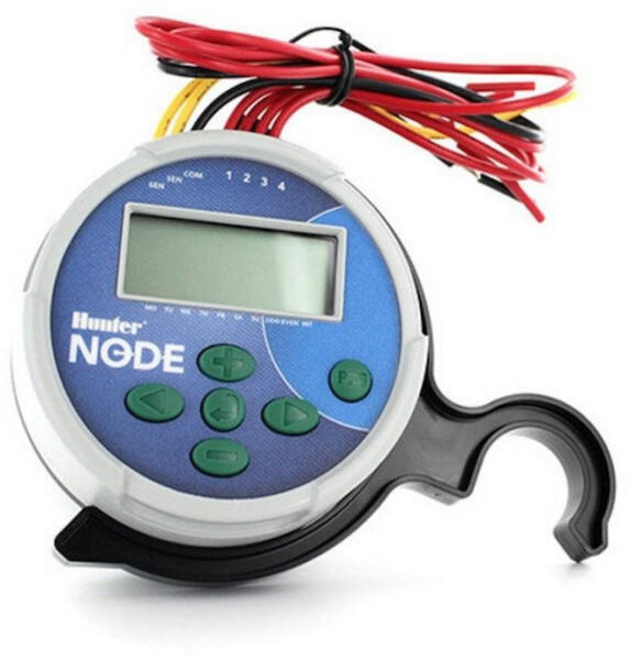 Hunter NODE-200 2 zónás elemes vezérlő A villamos hálózattól távol lévő, elszigetelt területek és csepegtető körök különleges igényei számára kínál a Hunter tökéletes, gazdaságos megoldást. A NODE 200-at gyorsan és könnyen föl lehet szerelni egy szelep szolenoidjára, csavarok, fúrók vagy kábelbekötések nélkül. Az egység szilárd felépítése révén a szelepakna mostoha körülményei között is működik. A NODE 200 egy 9 V-os elemmel garantáltan egy teljes szezonon keresztül megbízhatóan üzemel. A kivételes megbízhatóságán kívül még programozni is gyerekjáték, a bonyolult nyomógombok és kapcsolók helyett a jól látható folyadékkristályos kijelző révén. Kilenc indítási időpont lehetséges, így alkalmazkodik a friss vetésű gyep vagy a kis vízelnyelésű lejtők optimális öntözési ütemezéséhez. Jellemzők: