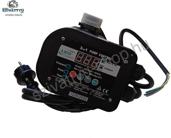 A Leo PS-04E-1 egység, NEM szivattyú, hanem egy szivattyú vezérlés, áramláskapcsoló. A szivattyú vezérlésére szolgál, mellyel automatizálható a szivattyú üzemeltetés. A Leo áramláskapcsoló a szivattyú nyomóágába építve ( csak függőlegesen) automatikusan indítja csapnyitásra a szivattyút, csap zárásra 10-15 mp –es késleltetéssel leállítja a szivattyút, ezen felül szárazonfutás ellen is megvédi szivattyúját. Ezen tulajdonságának köszönhetően kiváltja a hidrofortartályos, nyomáskapcsolós megoldást öntözéshez. A Leo PS-04E-1 áramláskapcsoló könnyú , kis helyszükségletet igényel, külön beállítást nem igényel. Az áramláskapcsoló indítási nyomása 1,5 bar, de ez állítható akár 3 bar nyomásra is, ezért a függölegesben beépített vízvételezési pont (csap) nem építhető be 30 méternél magasabban, mert ez esetben a visszaható vízoszlop magasság miatt nem tudná a szivattyút elindítani. A Leo PS-04E-1 áramláskapcsoló szárazonfutás esetén leállítja a szivattyút, de újra indításra nem képes! Csak manuális kézi indításra indul újra a RESET gomb megnyomásával. Az áramláskapcsoló elektronikus panelja cserélhető, igény esetén rendelhető. Elektromos bekötőkábellel rendelkezik.